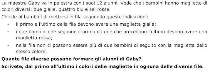 - Costruire le file a partire dai dati imposti dalle prime due regole: g, r, r …, r, r, g; applicare poi la terza regola che obbliga a disporre una « b » dopo o prima le due « r »: g, r ,r, b, …, b, r, r, g.