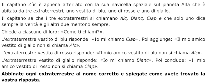 - si avrà che blu ≠ Alc e quindi può essere blu = Blanc oppure blu = Clap; le frasi dell’ET Blu (Io mi chiamo Clap; Giallo non si chiama Alc) devono essere entrambe false e perciò blu ≠ Clap e giallo = Alc; le frasi dell’ET giallo (Io mi chiamo Blanc; Rosso non si chiama Clap) devono essere entrambe false e perciò giallo ≠ Blanc e rosso = Clap; dedurre che, se giallo = Alc e rosso = Clap, allora blu = Blanc: gli abbinamenti rispettano sia la frase dell’ET rosso che è vera, sia le altre due frasi che sono false.