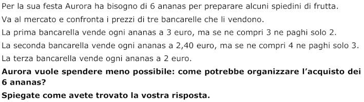 (La scelta di comprare i sei ananas da bancarelle diverse, per un maggiore risparmio, invece che dalla stessa bancarella è inconsueta nella pratica degli acquisti. Si attribuiscono quindi « 3 punti » agli allievi che non considerano questa possibilità e rispondono Aurora spenderà 12 euro in ogni bancarella)