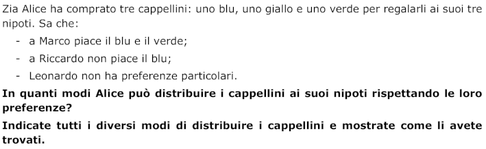 - Se Marco ha il blu, Riccardo può avere il verde e Leonardo il giallo, o Riccardo il giallo e Leonardo il verde (2 possibilità).