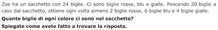 Comprendere che poiché Zoe ottiene almeno 2 biglie rosse per ogni estrazione di 20 biglie, ciò significa che il numero di biglie blu o gialle è minore o uguale a 18 e quindi che ci sono almeno 6 biglie rosse tra le 24 biglie nel sacchetto; con un ragionamento analogo, comprendere che il numero di biglie blu è almeno pari a 10 e il numero di biglie gialle è almeno uguale a 8.