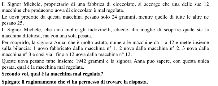 Undici macchine producono 25 g di uova di cioccolato e una macchina, mal regolata, 24 g. Determinare la macchina regolata in modo errato sapendo che il peso totale di 1 uovo della macchina n. 1, 2 uova della macchina n. 2, 3 uova della macchina n. 3, ecc. รจ di 1942 g.