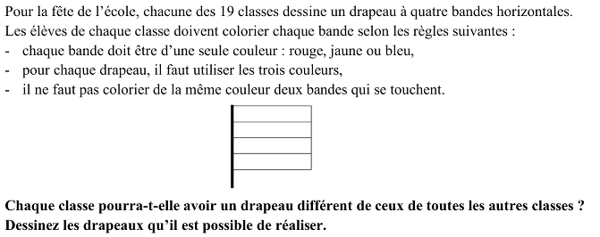 - Comprendre les contraintes : chaque bande d’une seule couleur, trois couleurs exactement pour chaque drapeau, deux bandes qui se touchent ne peuvent pas avoir la même couleur.