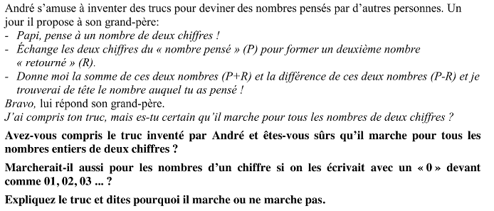 - On peut vérifier que le truc d’André marche pour tous les nombres, en considérant les cas particuliers des nombres de deux mêmes chiffres, ou des multiples de 10, ou des nombres d’un chiffre écrits avec un « 0 » comme dizaine.
