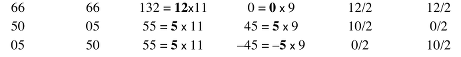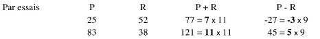 - Arithmétiquement, après un plusieurs essais, se rendre compte que l’un des facteurs de chaque somme P + R est la somme des valeurs des deux chiffres (exemple : 77 = 7x11 = (2+5)x11) et, de manière analogue, que l’un des facteurs de chaque différence P - R est la différence des valeurs des deux chiffres (exemple : -27 = -3 x 9 = (2 - 5) x 9 ) et par conséquent on peut trouver mentalement les deux chiffres dont on connaît la somme et la différence, par éliminations successives.