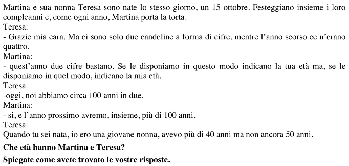 Il primo compito, complesso, consiste nel passare dal contesto del compleanno ai due numeri cercati che rappresentano l’età delle due persone. Per questo occorre comprendere che :