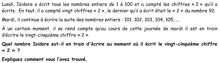 - Comprendre qu’il faut compter combien de fois le chiffre 2 apparaît dans la suite des entiers à partir de 101, quelle que soit la position à laquelle se trouve ce chiffre 2 : chiffre des unités ou des dizaines ou des centaines.