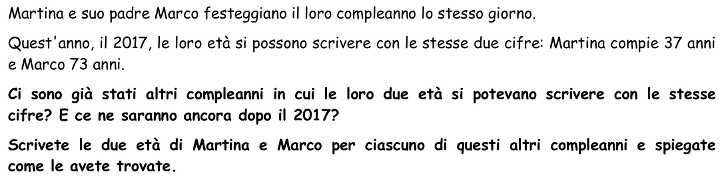 - escludere tutte le età di Martina minori di 10; tentare di invertire le cifre a partire da 12 e comprendere che la differenza aumenta sempre di 9, fino ad arrivare a 15 e 51, in cui la differenza è veramente di 36. Comprendere che oltre il 15 la differenza aumenta. Passare alla decina seguente, partendo da 23 e trovare 26 e 62, la cui differenza è 36. Si comprende a questo punto che c’è una regolarità; arrivare così alle età indicate nel testo, 37 e 73; le altre età che vanno bene saranno 48 e 84, 59 e 9, poiché ogni volta le età aumentano di 11 (una decina più una unità).