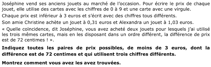 Dans un contexte de prix inférieurs à 3 euros, trouver toutes les paires de nombres décimaux (avec unités, dixièmes et centièmes) formés de trois mêmes chiffres, tous différents les uns des autres, et telles que la différence entre les deux nombres est 72 centièmes.