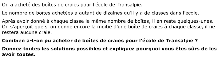 - Considérant ce reste et, en tenant compte du renseignement que si l’on distribue à chaque classe une demi boîte de craies, ils ne reste plus de craies, en déduire que le reste de la division de n par x est égal exactement à la moitié de x, d’où n = mx + x/2.