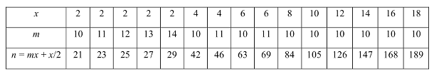 - Procéder par essais organisés en donnant successivement au nombre x de classes les valeurs : 2, 4, ... , 18, puis multiplier chaque valeur de x par un nombre m supérieur ou égal à 10 et ajouter la moitié de x. Ne conserver que les nombres dont les dizaines sont égales au nombre x. Obtenir ainsi tous les nombres n possibles que l’on peut présenter dans un tableau comme celui-ci :