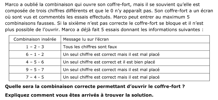- Comprendre que la combinaison du coffre-fort est composée de 3 chiffres différents compris entre 1 et 9, qui doivent être déterminés et insérés dans l’ordre correct selon les indications de l’énoncé.