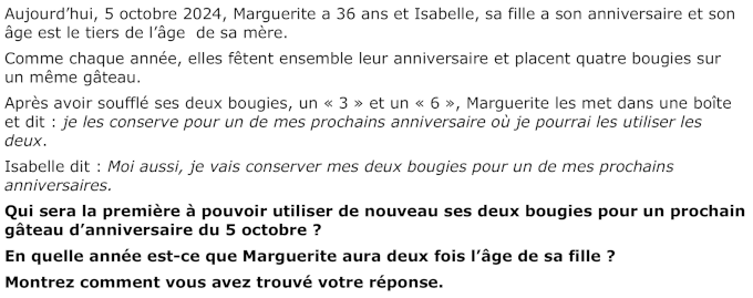 Année Âge M. Âge I. 2024 36 12 2025 37 13 ... ... ... 2033 45 21 Isabelle sera la première, en 2033 ... ... ... 2036 48 24 L'âge de Marguerite sera le double de celui d'Isabelle en 2036 ... ... ... 2042 54 42 En 2042 Marguerite pourra utiliser ses deux bougies ... ... ... 2051 63 51