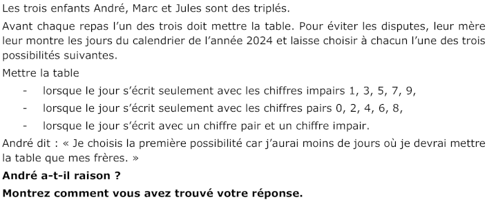 Les données de ce tableau permettent de dire que André a tort parce que, pour chaque mois de 28, 29, 30, 31 jours (que l’année soit bissextile ou non ne change rien) le nombre de jours avec chiffres pairs est inférieur au nombre de jours avec chiffres impairs.