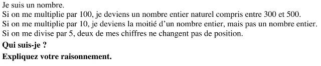 Trouver le nombre qui, multiplié par 100 devient un nombre naturel compris entre 300 et 500, multiplié par 10 devient un nombre non entier moitié d’un nombre naturel, divisé par 5 devient un nombre dont deux chiffres ne changent pas de position.