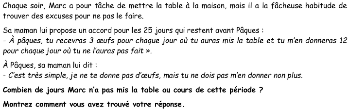- Comprendre que pendant les 25 jours Marc a mis la table certains soirs et qu’il ne l’a pas fait d’autres soirs. Comprendre également que le nombre d’œufs qu’il aurait dû recevoir et le nombre d’œufs qu’il aurait dû donner s’équilibrent. - Procéder par essais et ajustements, par exemple partir de l’hypothèse « 12 jours où il a mis la table et 13 où il ne l’a pas mise » et calculer le nombre d’œufs correspondant, puis, ajuster progressivement le nombre de jours jusqu’à atteindre l’égalité des œufs reçus et donnés.