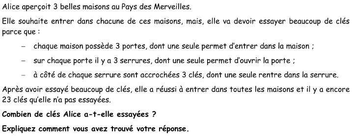 - Imaginer la situation, s’approprier la démarche d’essais des clés et comprendre que, pour trouver le nombre de clés qu’Alice a essayées, il faut trouver la différence entre le nombre total de clés et le nombre de clés qu’Alice n’a pas essayées (23). Une représentation de la situation peut faciliter cette appropriation.