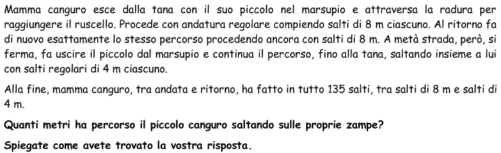 - Capire che nella seconda metà del percorso di ritorno, mamma canguro esegue salti lunghi la metà di quelli fatti fino ad allora e che quindi per raggiungere la tana dovrà fare il doppio dei salti che ha fatto nella prima metà del percorso di ritorno.