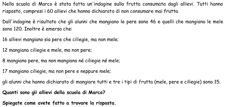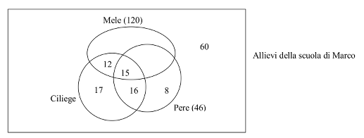 - Il numero degli allievi della scuola si può calcolare sommando 120 (allievi che mangiano mele) con quelli che non mangiano mele, cioè 17 (che mangiano solo ciliegie), 16 (che mangiano pere e ciliege), 8 (che mangiano solo pere) e 60 (che non mangiano frutta). Si ottiene così che il numero degli allievi è 221.