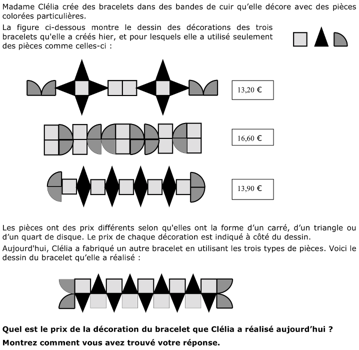 - Déterminer enfin le prix d’une pièce triangulaire à partir du prix du premier ou du troisième bracelet. Par exemple à partir des informations maintenant connues sur le premier bracelet, on trouve 0,90 euro ([13,20 – 0,80 x 4 – 0,70 x 4] : 8).