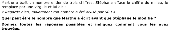 - Constater que le chiffre des unités, devenu dixièmes, ne peut être 0 car, sinon, le nombre substitué serait entier et égal à celui des centaines du nombre d’origine : le produit d’un nombre par 90 ne peut être égal à son produit par 100. Même constatation pour le chiffre des centaines du nombre d’origine qui est un « nombre entier de trois chiffres ».