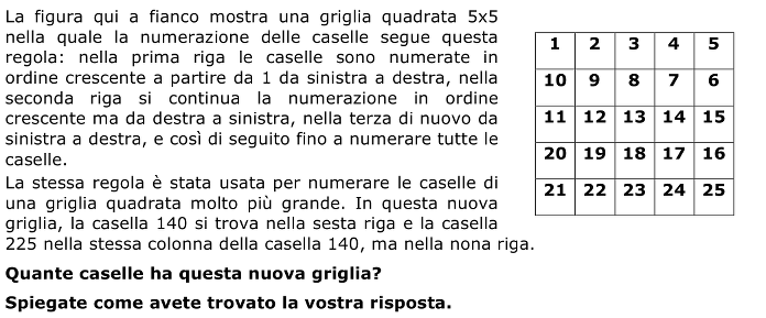 Oppure chiamando n il numero di righe e colonne della griglia quadrata, rendersi conto che affinché 140 stia nella sesta riga, deve essere 5n+1≤ 140 ≤ 6n, o, analogamente, 5n ≤ 139 e 140 ≤ 6n e ricavare quindi le tre possibilità per n: 25, 26, 27.