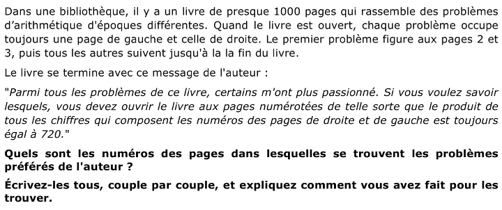se rendre compte que le 5, ne paraît qu'une seule fois dans la décomposition en facteurs premiers de 720, il doit donc occuper seulement la place des unités d'un des nombres qui constituent les couples cherchés, c'est-à-dire celui de la page de droite, parce qu'impair. L'autre numéro doit donc être le nombre précédent et donc finir par 4.