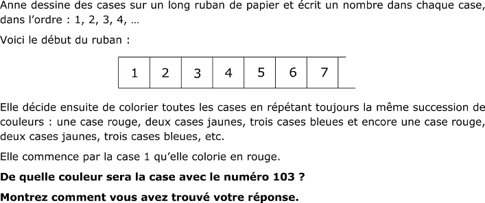 - Se représenter ou construire un ruban (ou une partie) des nombres naturels de 1 à 103 et colorier les cases en rouge, jaune, jaune, bleu, bleu, bleu, rouge …