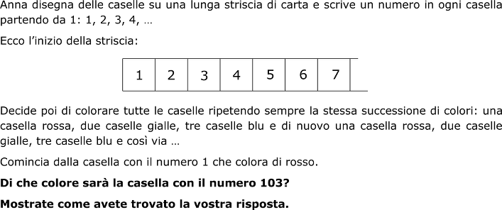 - numerare tutta la striscia fino al 103, colorare le caselle e osservare che il colore della casella103 è rosso, se non ci sono stati errori nella numerazione né nella colorazione periodica;