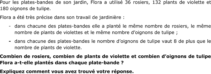 - À partir de la différence de 48 entre violettes et tulipes pour l’ensemble des fleurs, déterminer le nombre de plates-bandes (6) en effectuant une simple division par 8. Partant de là, déterminer le nombre de fleurs de chaque catégorie dans une plate-bande en divisant le nombre total de fleurs d’une catégorie par 6 et conclure qu’il y a 6 rosiers, 22 violettes et 30 tulipes