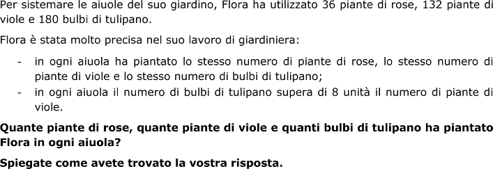 - a partire dalla differenza di 48 tra viole e tulipani per l’insieme dei fiori, con una semplice divisione per 8 si trova il numero delle aiuole (6);si procede dividendo per 6 il numero delle rose (36:6), quello delle viole (132:6) e quello dei tulipani (180:6). Si otterranno 6 aiuole in ciascuna delle quali ci saranno 6 piante di rose, 22 piante di viole e 30 bulbi di tulipano. I numeri trovati rispettano le condizioni indicate nel testo;
