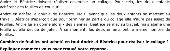 - Comprendre donc que les deux enfants ont le même nombre de feuilles depuis qu’André, qui initialement en avait le double de Béatrice, lui en a donnée 7 et qu’elle en a jeté une.