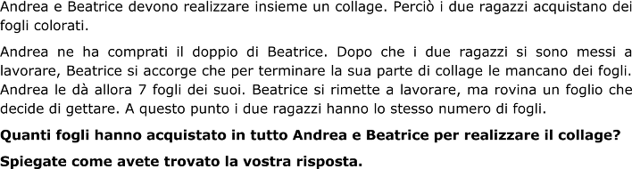- Capire quidi che i due ragazzi hanno lo stesso numero di fogli dopo che Andrea, che inizialmente ne ha il doppio di Beatrice, gliene ha dati 7 e lei ne ha gettato uno.