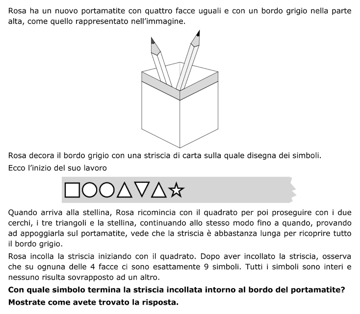 - Disegnare i simboli rispettando la sequenza fino ad avere 36 simboli e trovare così che l’ultimo simbolo è un quadrato.