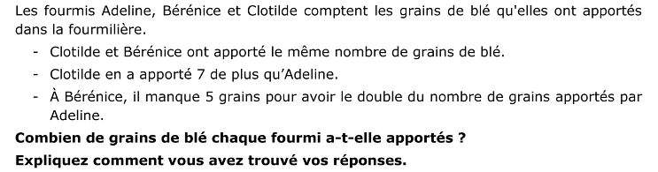 Par une méthode algébrique ou pré-algébrique, noter A le nombre de grains apportés par Adeline. Bérénice en a 2A – 5 et Clotilde A + 7. Comparer les deux dernières expressions des nombres de grains de Bérénice et de Clotilde : 2A – 5 = A + 7 et en déduire, en résolvant l'équation par des méthodes algébriques ou par essais, que le nombre de grains d'Adeline est égal à 12. Par conséquent, les deux autres fourmis en ont 19.
