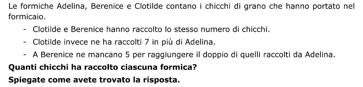 - Per via algebrica o prealgebrica, indicato con A il numero dei chicchi di Adelina dedurre che quelli di Berenice sono 2A − 5, quelli di Clotilde A + 7, confrontare le due ultime espressioni relative ai chicchi di Berenice e Clotilde: 2A−5= A + 7 e dedurre, risolvendo l’equazione con metodi algebrici o per tentativi, che il numero di chicchi di Adelina è 12; di conseguenza quello delle altre due formiche è 19.