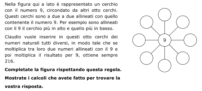 - Capire che bisogna trovare, per ogni coppia di cerchi allineati, due numeri il cui prodotto, moltiplicato per 9 dia 216.