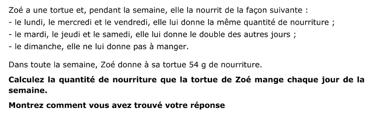 - Comprendre que Zoé donne à la tortue la même quantité de nourriture trois jours par semaine et pendant trois autres jours le double.