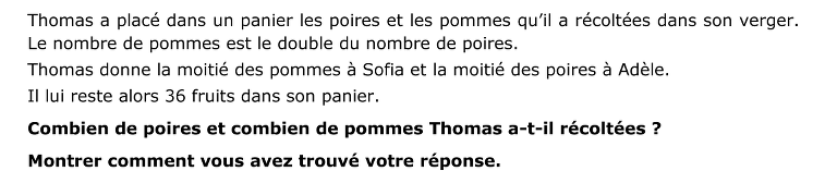 - Comprendre que si Thomas donne la moitié de ses pommes et de ses poires, la moitié du nombre de pommes et de poires récoltées reste dans le panier. Comprendre que la relation entre le nombre de pommes et le nombre de poires est la même qu’entre leurs moitiés. Le problème revient à chercher deux nombres dont l’un est le double de l’autre et dont la somme est 36 et de doubler ensuite les deux nombres trouvés. Plusieurs démarches possibles