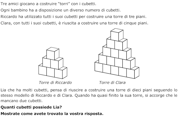 - comprendere che Lia non ha cubetti sufficienti per costruire una torre di dieci piani, le mancano due cubetti.