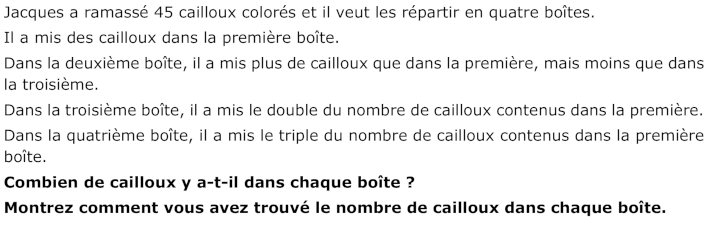 Les savoirs mobilisés sont élémentaires : arithmétique sur des nombres ne dépassant pas la cinquantaine, comparaisons au moyen des relations « plus que » et « moins que » ; « le double » et « le triple » ; addition et soustraction, multiplication, intervalles pour le 2e nombre, avec maximum et minimum.