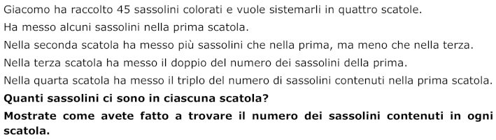 Trovare quattro numeri di cui si conosce la somma (45) sapendo che il terzo e il quarto sono rispettivamente il doppio e il triplo del primo e che il secondo è maggiore del primo e minore del terzo.