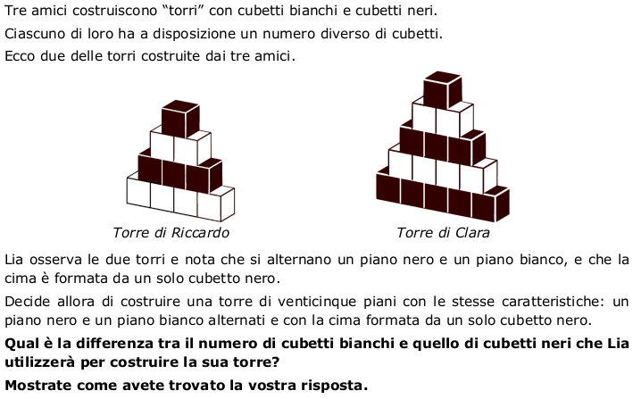 - Dopo avere costruito le torri di Riccardo $(B – N = 2)$ e Clara $(N – B = 3)$ considerare la torre successiva e verificare che la differenza è ancora $3$. Considerarne quindi le ulteriori due successive e verificare che la differenza tra il numero dei cubetti neri e quello dei cubetti bianchi risulta $4$. Intuire quindi che le differenze sono uguali tra loro per le coppie successive. A quel punto procedere nel conteggio, o trovare una strategia per calcolare senza scrivere tutti i tentativi, ad esempio $24 / 2 + 1$, fino a determinare come la differenza per la torre con $25$ piani sia di $13$ cubetti.