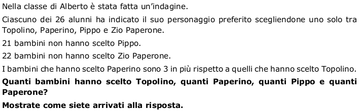 - Appropriarsi della situazione per comprendere che ci sono $26$ alunni che devono suddividersi in quattro gruppi (disgiunti) secondo le loro scelte (Topolino, Paperino, Pippo e Zio Paperone);