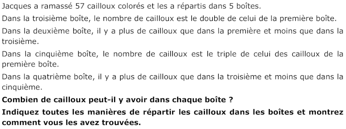 A la lecture de l’énoncé imaginer la décomposition de 57 en une somme de 5 termes. respectant les relations données.