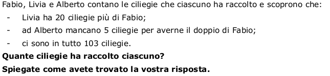 - Allontanarsi dal contesto delle ciliegie e percepire i tre numeri ancora sconosciuti (di F, di L e di A) e le loro tre relazioni: L ha 20 in più di F; A è 5 meno del doppio F; la somma è 103.