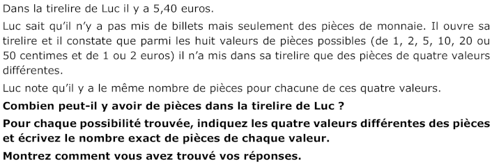 - Comprendre que, lorsque l’on a choisi les quatre valeurs différentes ; par exemple 1 ; 0,5 ; 0,2 ; 0,05 on peut calculer la somme 1 + 0,5 + 0,2 + 0,05 = 1,75 € ou 175 centimes et que si on prend le même nombre de fois chacune de ces valeurs, par exemple 3, la somme des valeurs de l’exemple précédent serait 3 × 175 = 525. Comme 540 n’est pas un multiple de 175 , ce choix des quatre valeurs est à rejeter.