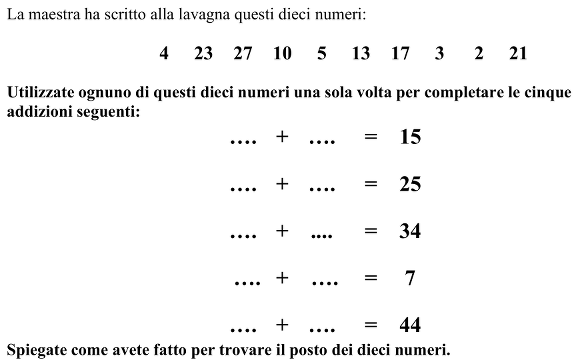 Con i dieci numeri: 2, 3, 4, 5, 10, 13, 17, 21, 23, 27 formare 5 coppie di cui le somme siano 7, 15, 25, 33, 44.