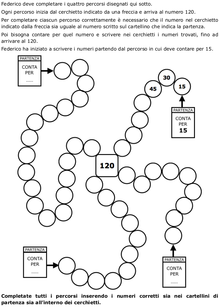 - Appropriarsi della situazione: i quattro percorsi rappresentati nell’immagine devono essere completati con la sequenza ordinata dei multipli dei numeri indicati nei cartellini posti all’inizio di ciascun percorso fino ad arrivare al numero $120$; il percorso dei multipli di $15$ è già iniziato e deve essere completato; per completare gli altri percorsi è necessario trovare prima la regola che determina ogni successione.