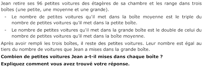 - Algébriquement: établir et résoudre l’équation où l’inconnue x est le nombre de voitures dans la petite boîte: $x + 3x + 6x + 2x = 96$. Dont la solution est $8$.